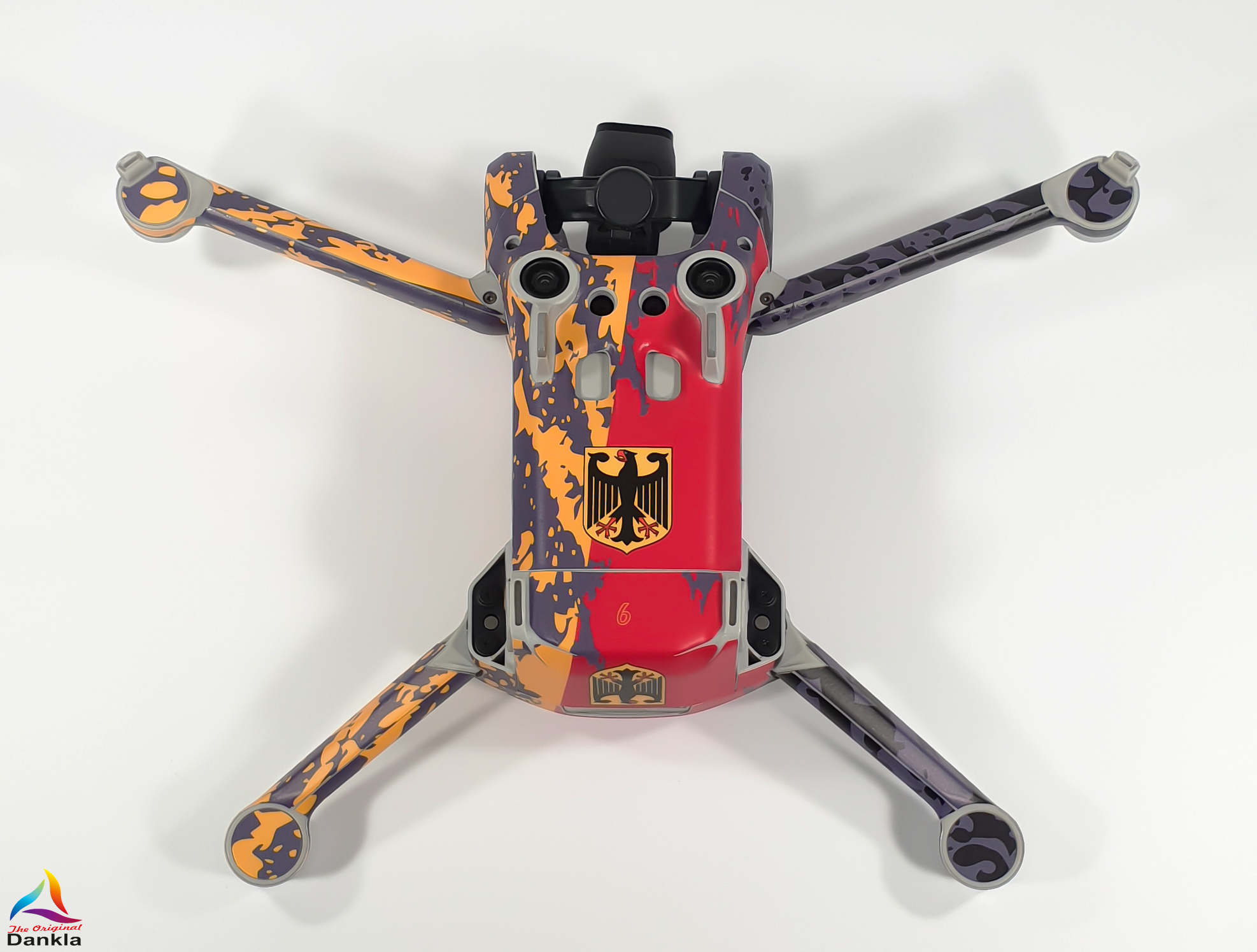 Die Drohne sollte vor der Anbringung der Folie unbedingt mit einem nicht aggressiven Reiniger gereinigt werden. (z.B. Glasreiniger)